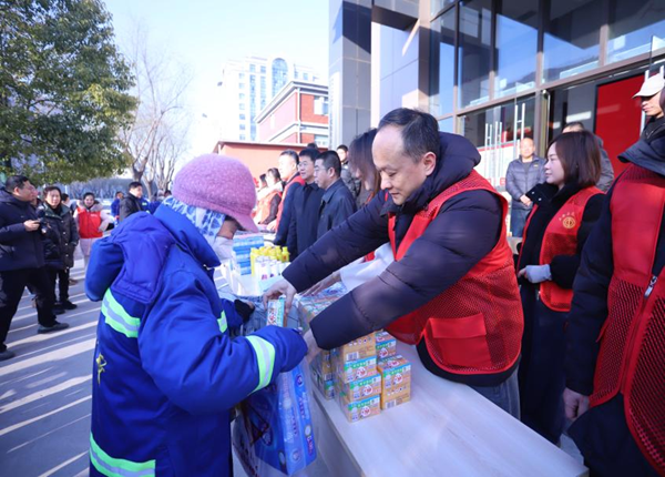 活动现场,为环卫工人准备了许多慰问品,有防风棉大衣、防寒手套、保温杯、洗发水、洗衣液、香皂、肥皂、大米、食用油等物品。社区工作人员和参加此次活动的志愿者代表有序为环卫工分发慰问物品,为城市“美容师”送上浓浓的暖意。