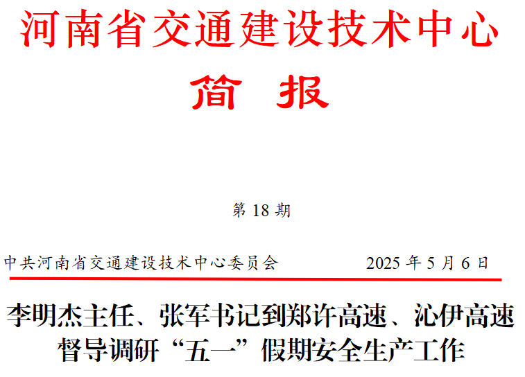 为认真贯彻落实厅党组关于做好“五一”假期和暑期汛期在建项目安全生产工作的要求,5月4日至5日,李明杰主任、张军书记带队分别到郑许高速、沁伊高速督导调研“五一”假期安全生产工作。